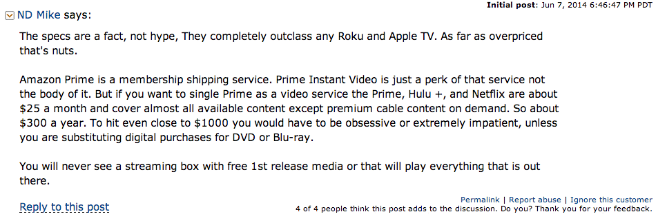 Amazon Fire is overhyped. it’s also overpriced. I however, got a 30 day free trial with free shipping. so, I didn’t have to spend one penny. the Amazon Fire is slow. it tells you all the specs like “hey! we have a better processor speed than the other guys” which I did not by. also, the voice search could be better. I searched for “Mariska Hargitay” it took 2 tries for it to get it right. the box itself is simple. yet boring. not enough free stuff and speeds are slow when trying to play a game or start a movie. what they need to embrace is demos and 30 second clips. if they did that people would be more prone to buy tv shows,movies etc… Amazon prime is over $100 a year. it’s pricey for what you get and I feel the TV and Movie industry is dead. I mean if you were a serious fan of tv shows and movies. you’d end up spending $500 to $1,000 a year on content. you’d need Hulu,Amazon Prime,Netflix,HBO,Showtime,Directv or whatever else. if there was a way to watch everything on one goddamn device. that would be swell. anyway.. this box is not for me. I don’t recommend it. I would wait till something better comes along. thanks for reading my rant about the Amazon Fire.