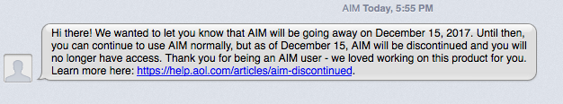 “We’ve made the decision that we will be discontinuing AIM effective December 15, 2017,” a rep for the company confirmed.