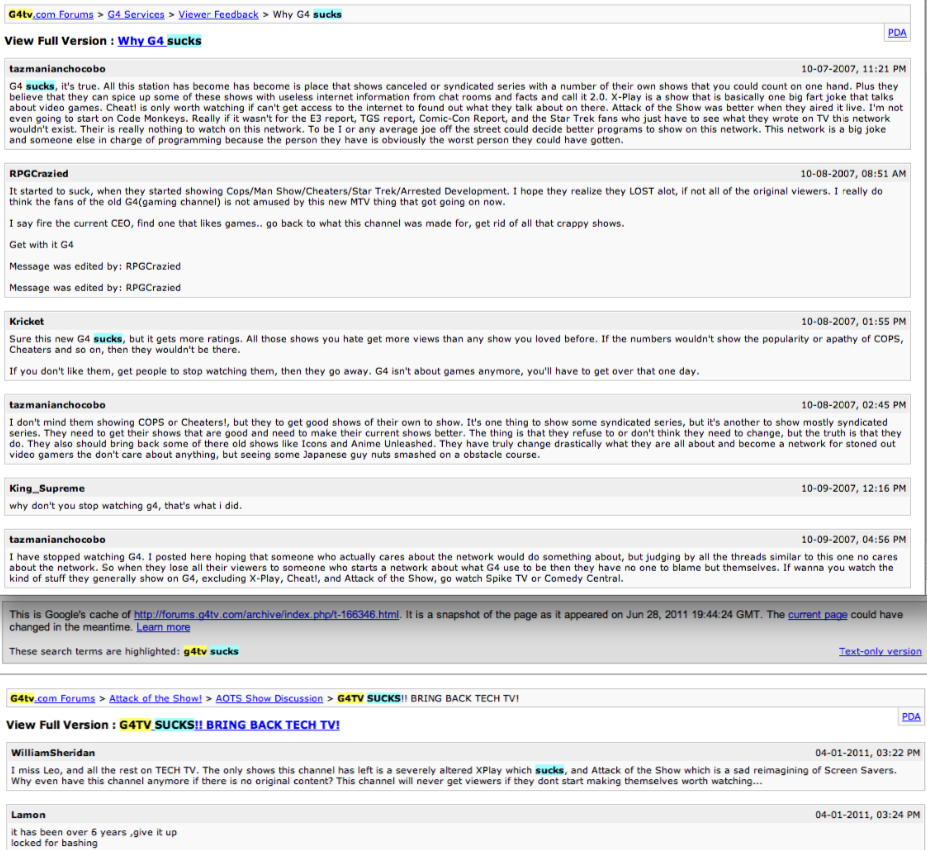 Holy sh*t… dead last? I don’t know whether to laugh or to cry, quite honestly. I loved being at TechTV, and I believe there’s still a place for technology on the television screen. This news is really too bad, as it’s likely to discourage any other network to pick up the ball and run with it. Talented geeks are hard to come by – and even when they can be found, you have to be willing to pay for their services.