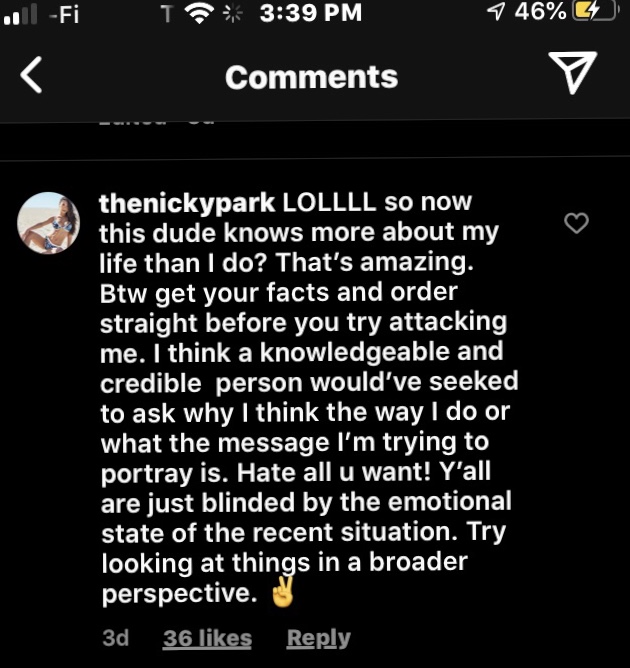 of course, Nicky Park. Has not reached out for comment. because she has gone into hiding. On social media. A comedian named David blasted her on Instagram about her racism and tone deaf response to the movement.